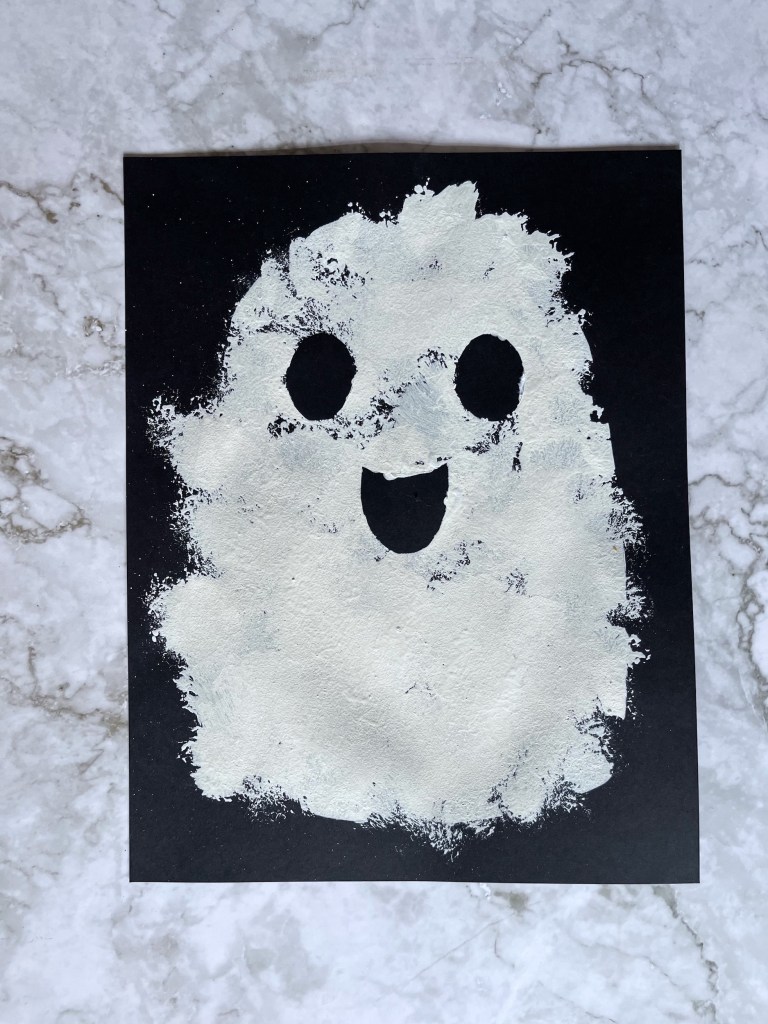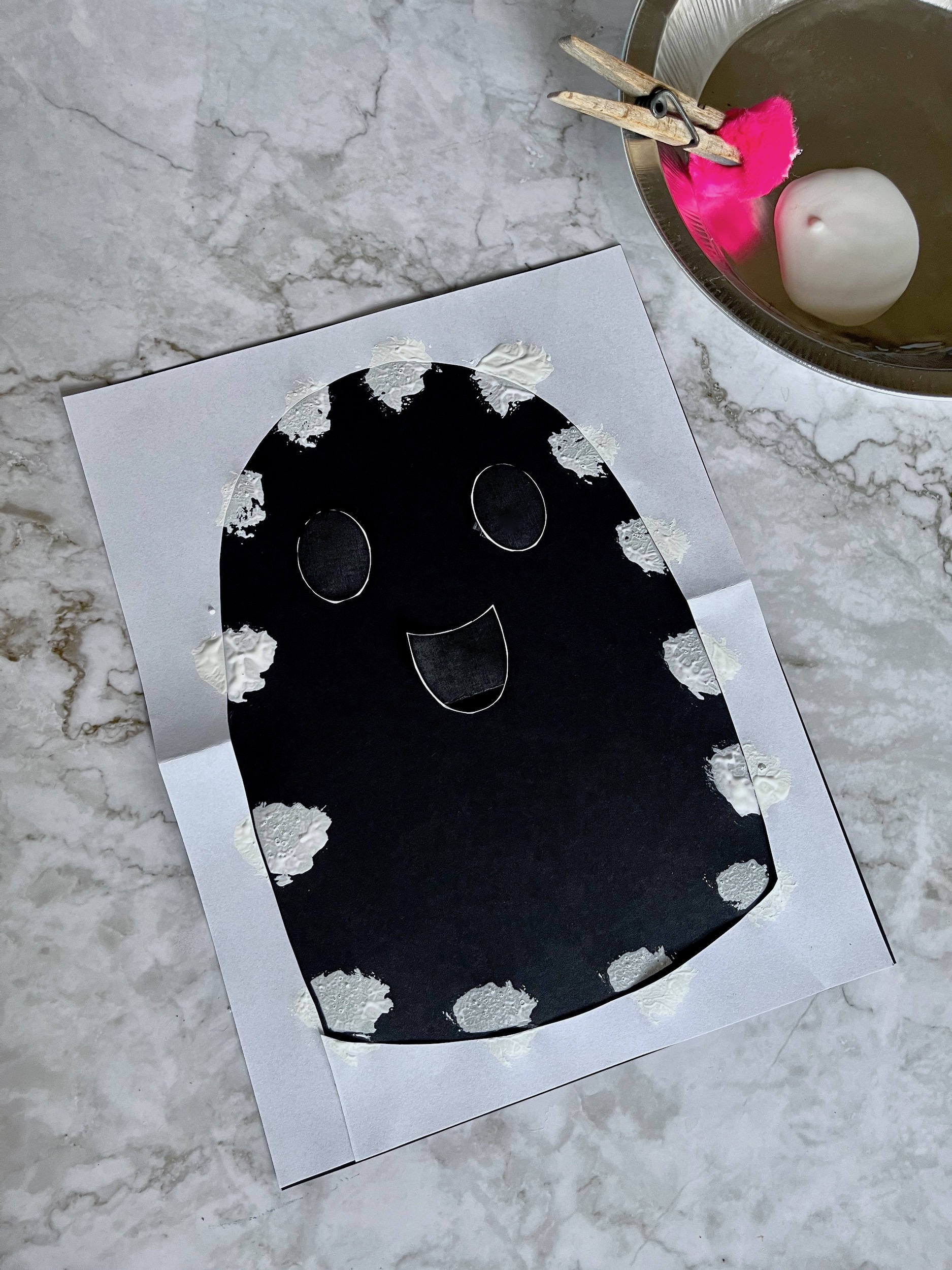 - Place the ghost pattern’s frame around the edges of your cardstock page and dab the pom pom in the white paint, then dab it around in the edges of the ghost’s shape to create a dotted pattern for your little one.