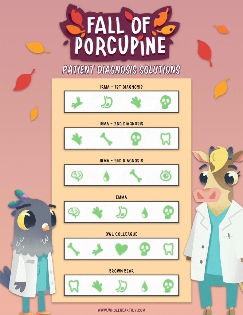 I’ve been playing Fall of Porcupine and while I like changing dressings, injections, monitoring heartbeats and prescribing medications, the diagnosis mini-game is not my favorite. I feel the need to ace all of my treatments and the diagnosis kept tripping me up! So whether you want to ace the diagnosis the first time, or if you’re having trouble and just want to move past it I’ve created a guide page with the solution to each diagnosis.