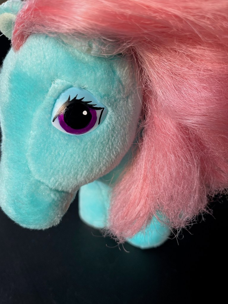 I dug through my parent’s garage and found my classic My Little Pony plushies (or Hasbro Softies) from the 1980s! In my memory they were in perfect condition, in reality their bodies are in good condition with no visible stains, but their manes and tails were a matted mess! I also noticed a great deal of their eye paint had scratched off!