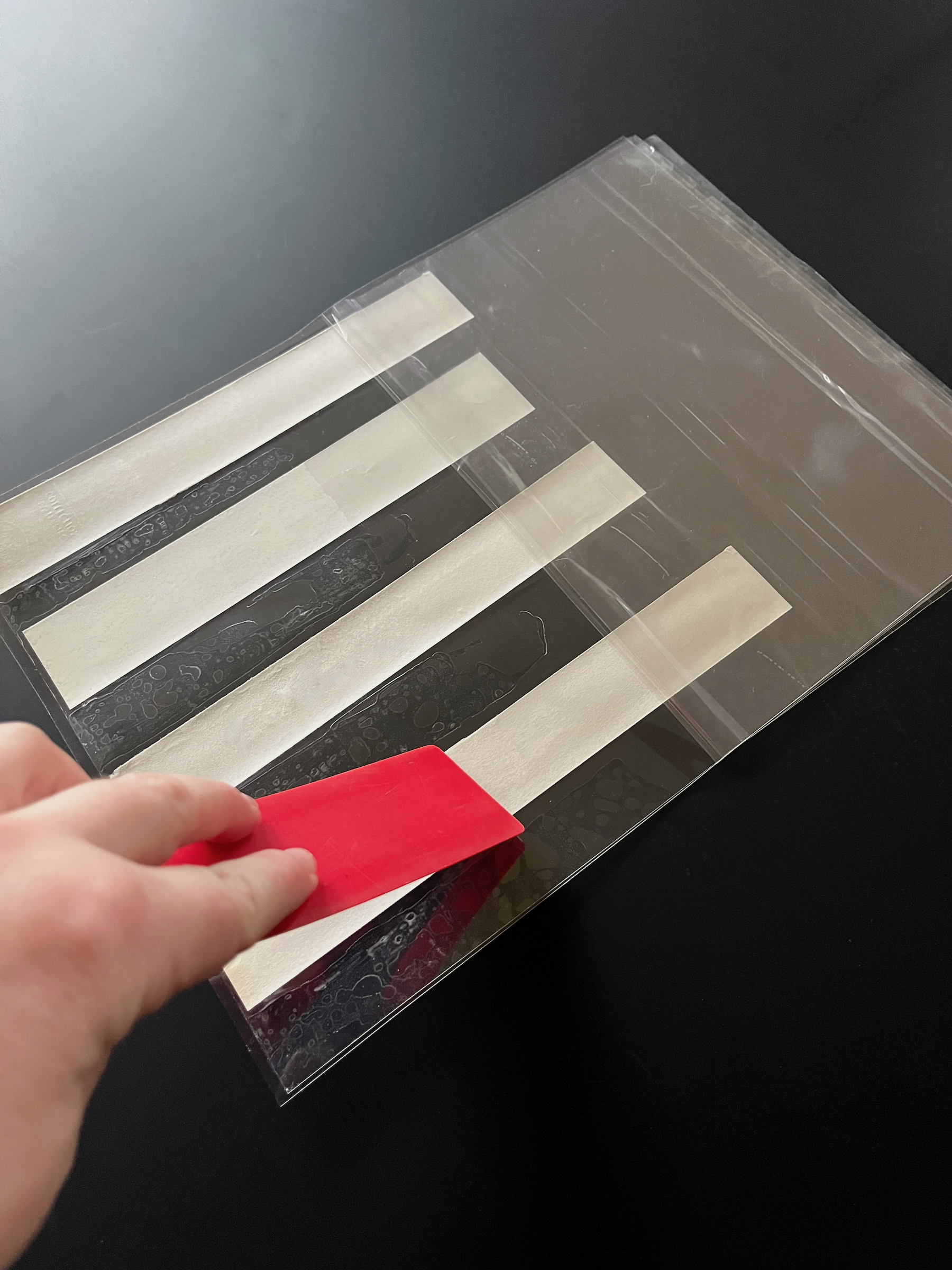 - Turn the laminate page over and use a plastic ruler to smooth the laminate onto the artwork, removing any air bubbles.