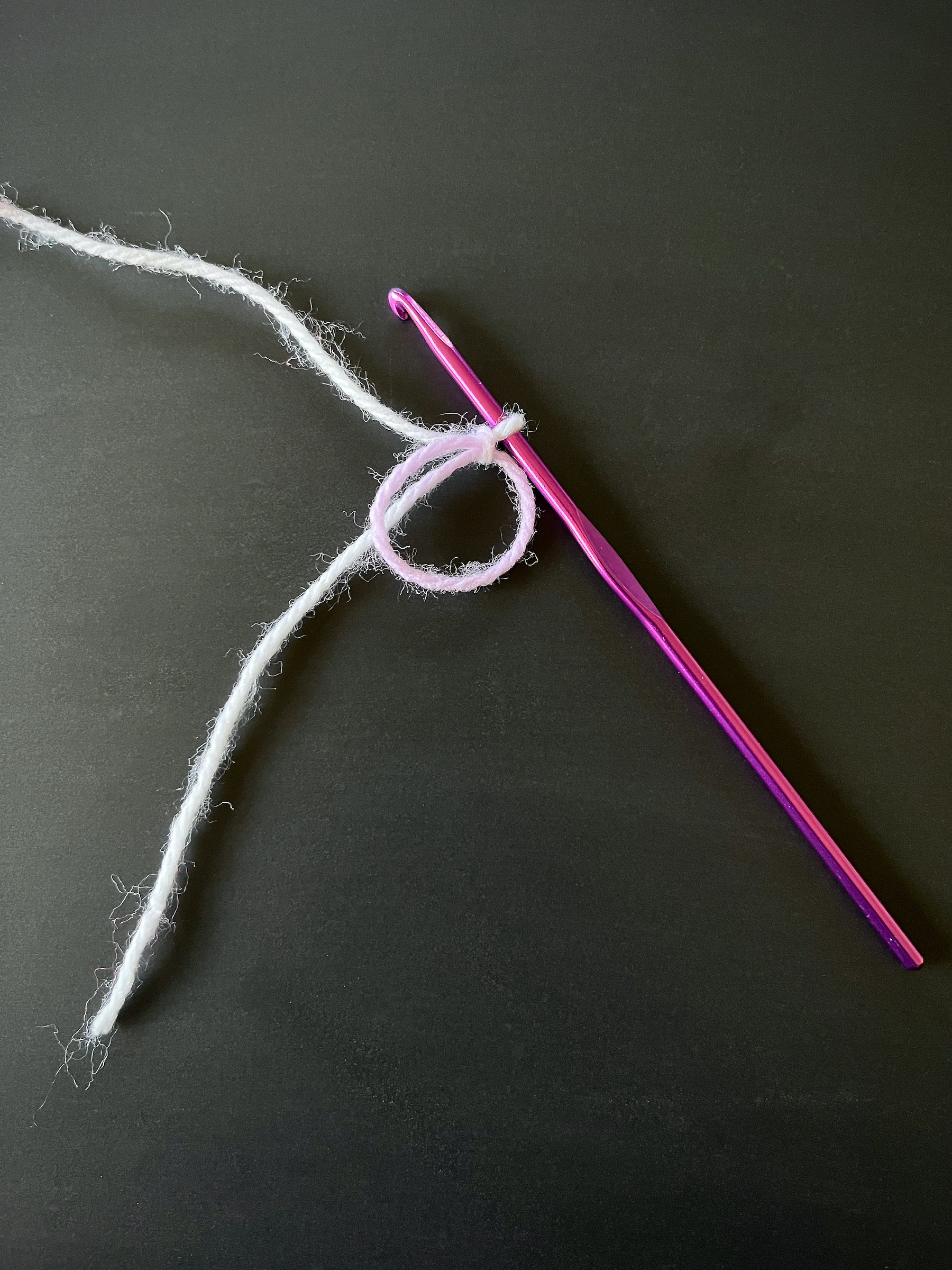 - Using the smaller yarn and hook create a magic ring and chain two.