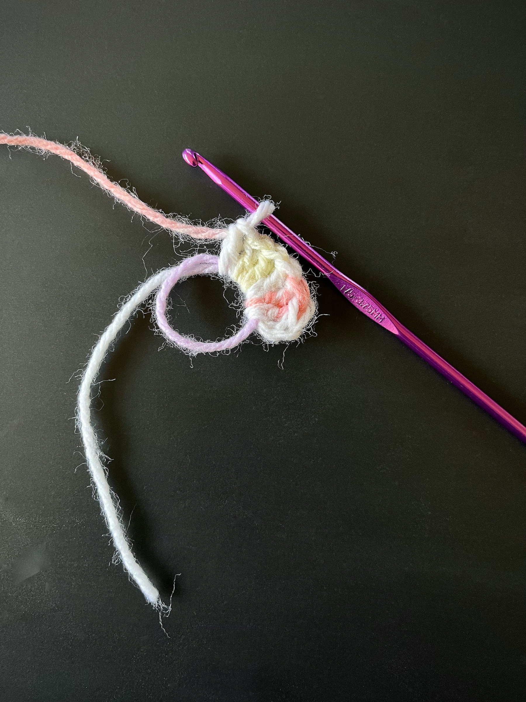 - Chain three and slipstitch into the magic ring.