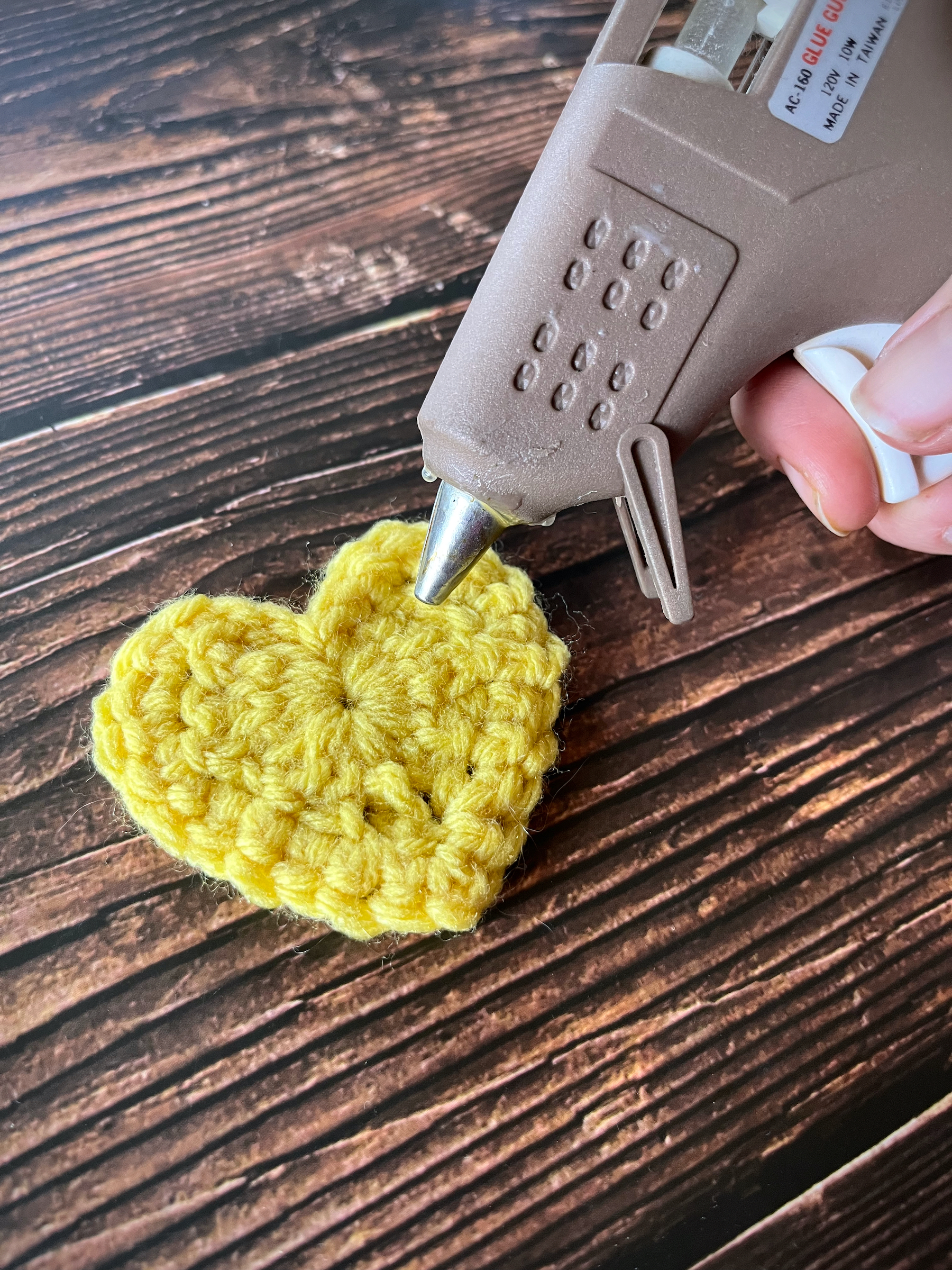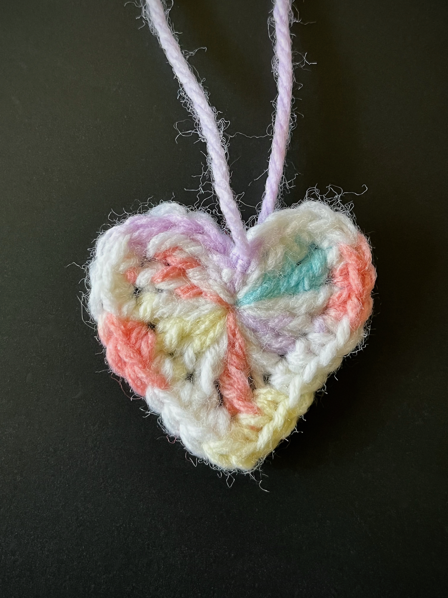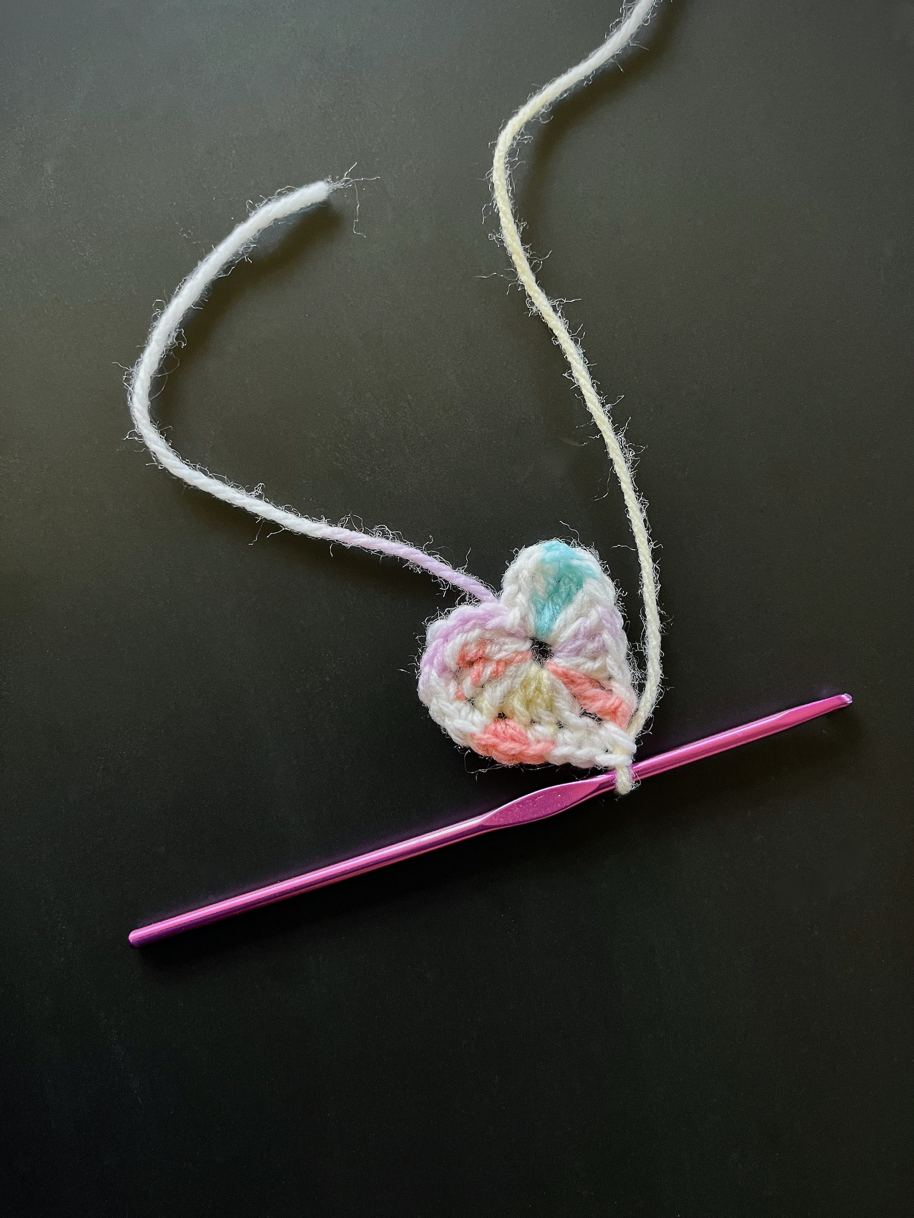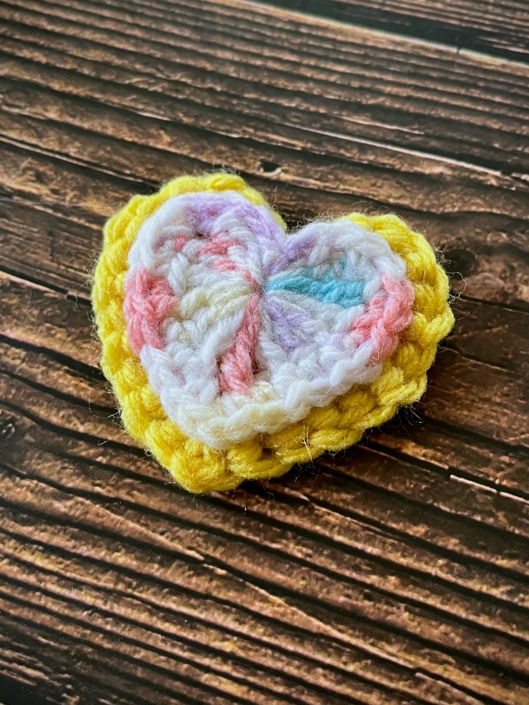- Using a smaller crochet hook, weave the starting yarn and ending yarn into the heart.