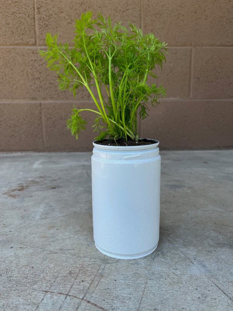 4. Once the final layer is on and the cans are dry, flip them back over and place a layer of soil in the bottom. Place your herbs in the can and surround with more soil to stabilize the planted herb.
