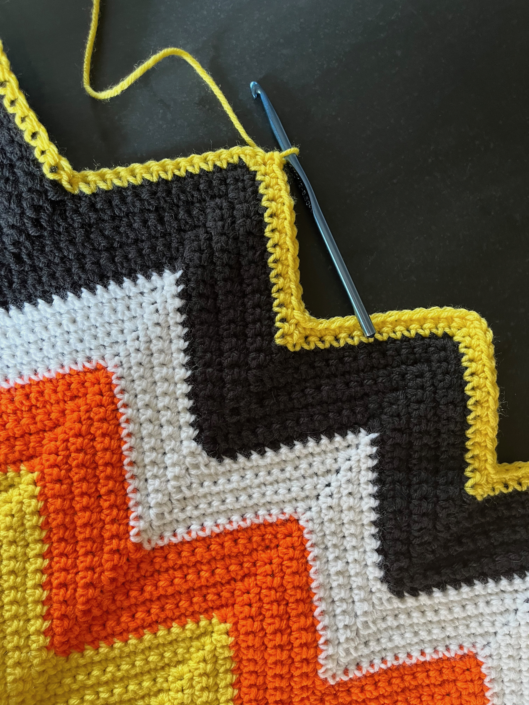 13. When you’ve reached the end of your last black row, chain two and rotate the blanket 90 degrees. Begin single crocheting down the side of the blanket.