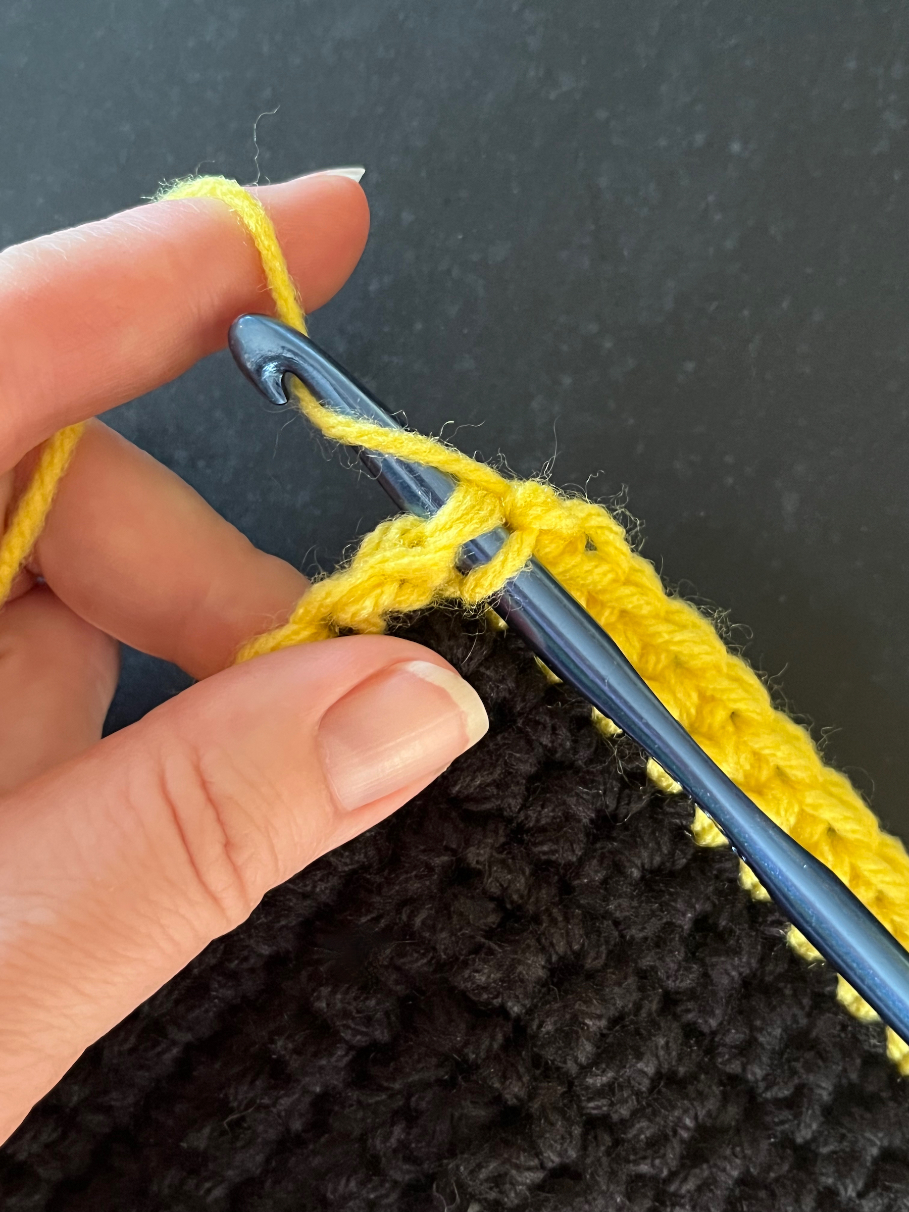 10. To change colors, halt halfway through your final single crochet of the row when two loops are over your hook, hook onto your new color (yellow), and pull it through. Cut off the previous color of yarn and weave the tail into the blanket with a yarn needle or small crochet hook to secure it.