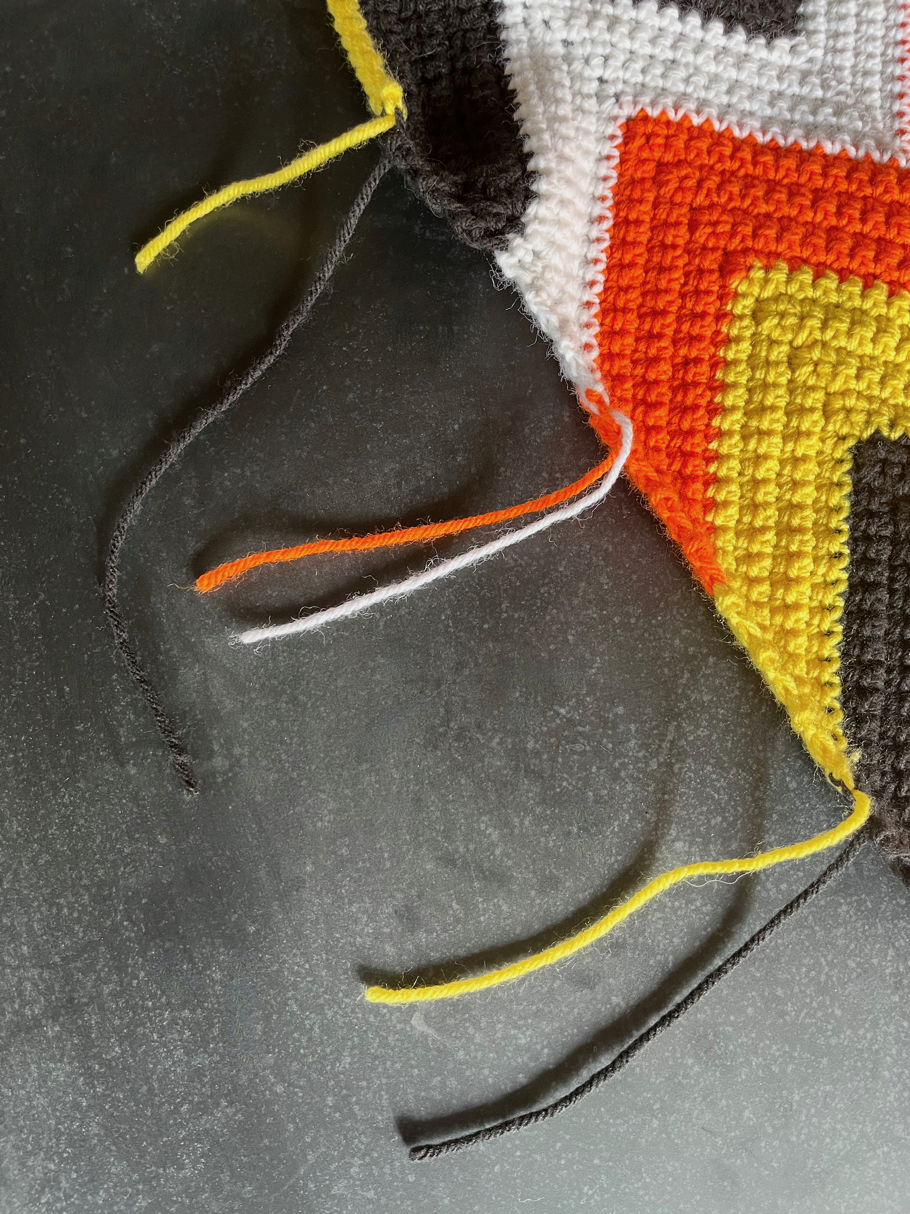 27. Knot and sew the remaining tail of yarn into the yellow stitches around.