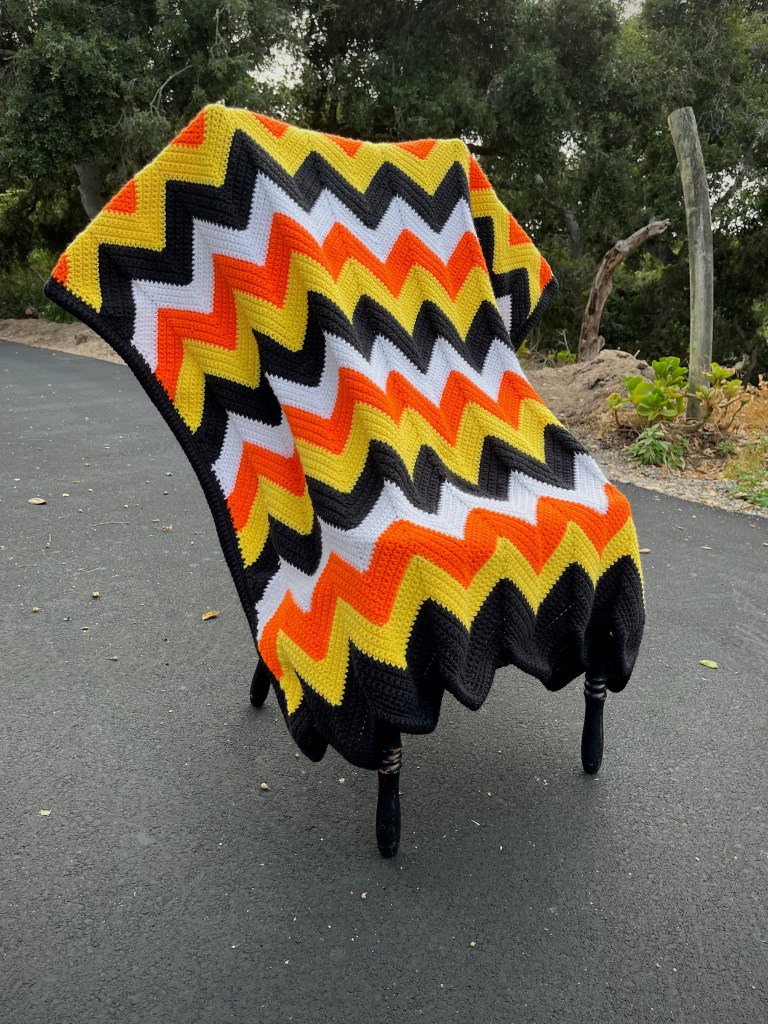 It’s that time of year for autumn and Halloween decor, so let’s create a chevron Halloween blanket! I thought it would be creative to make a candy corn color pattern framed by black on either side. Mine is the size of a lap blanket, but you can use this pattern to create any size you choose!