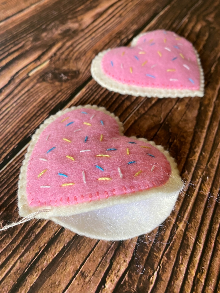 Using a whipstitch, begin sewing around the edges of the heart cookie, concealing the first knot and end knot in between the layers.