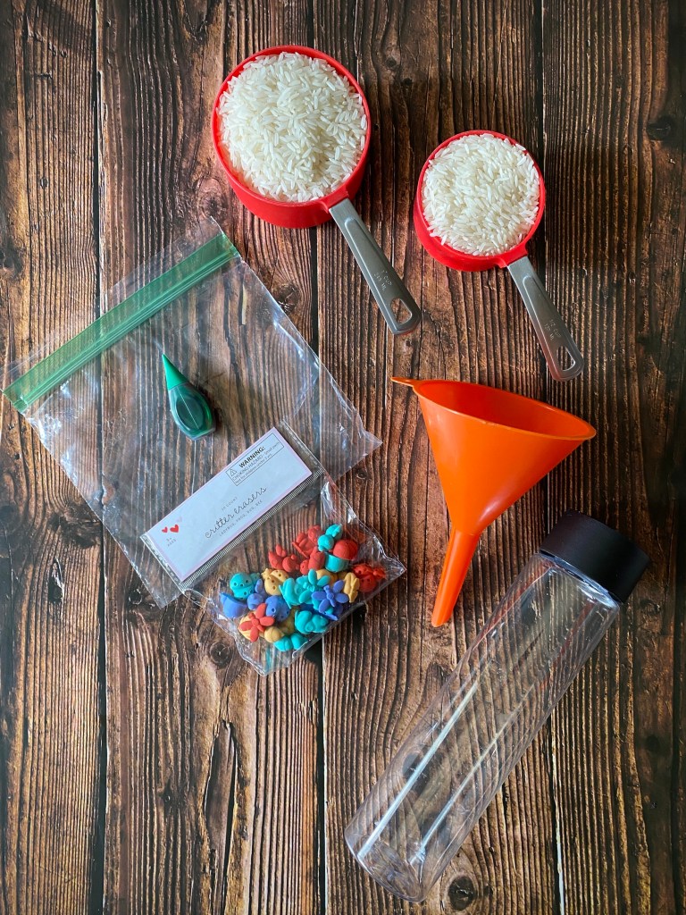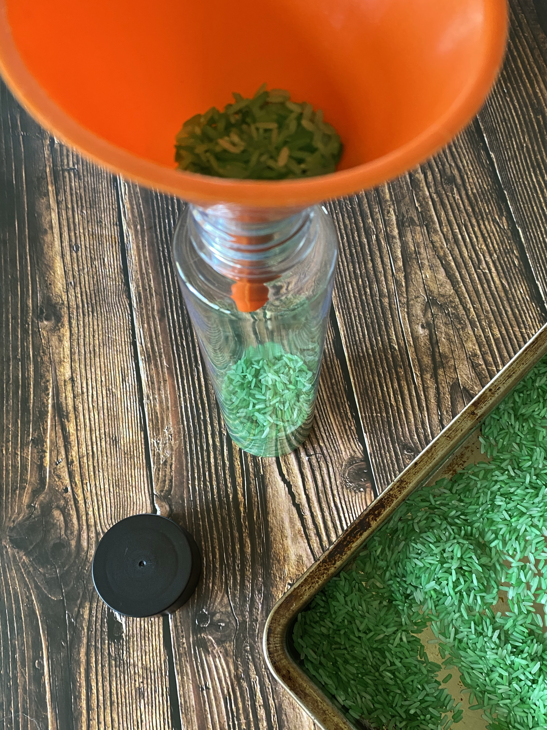 - Place the funnel in the mouth of your bottle and use it to fill the bottle with half of the rice.
