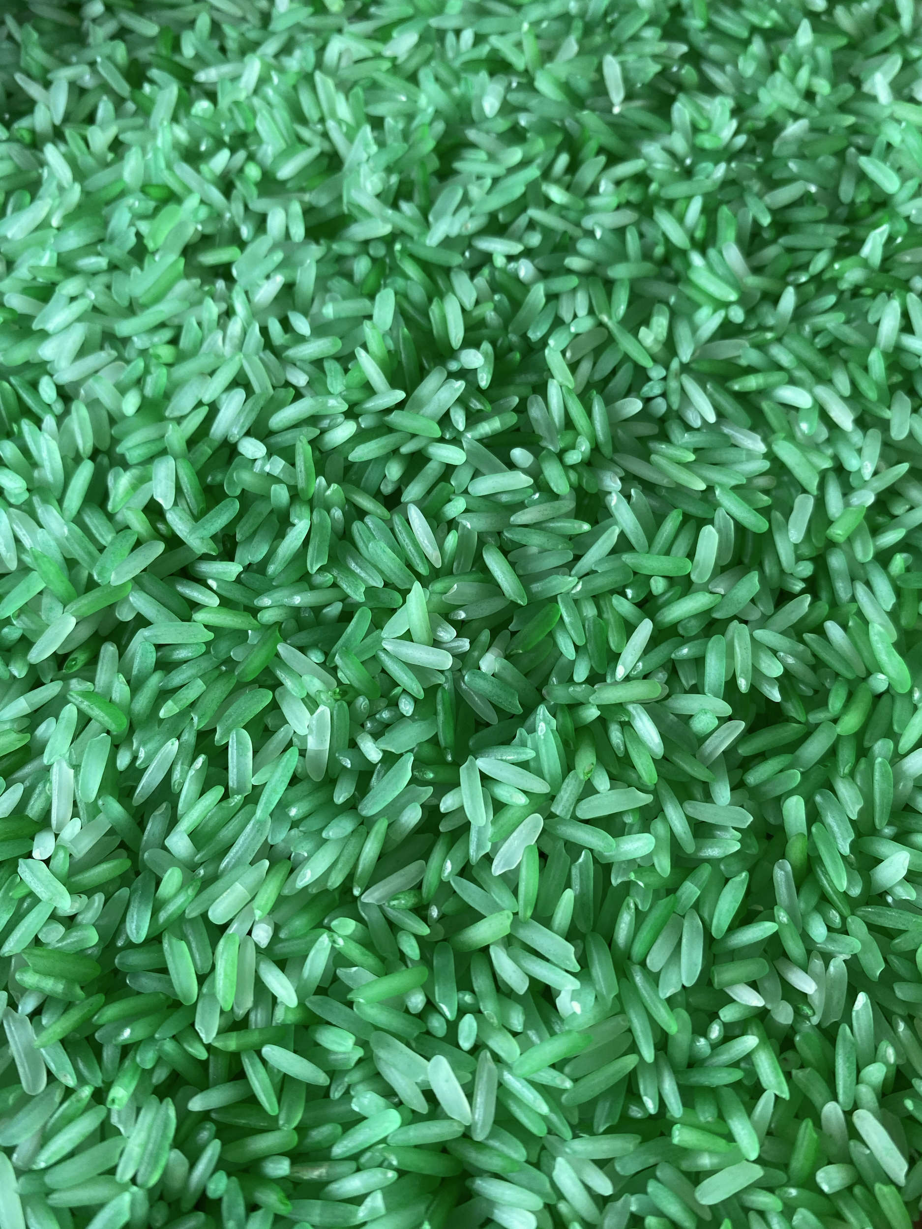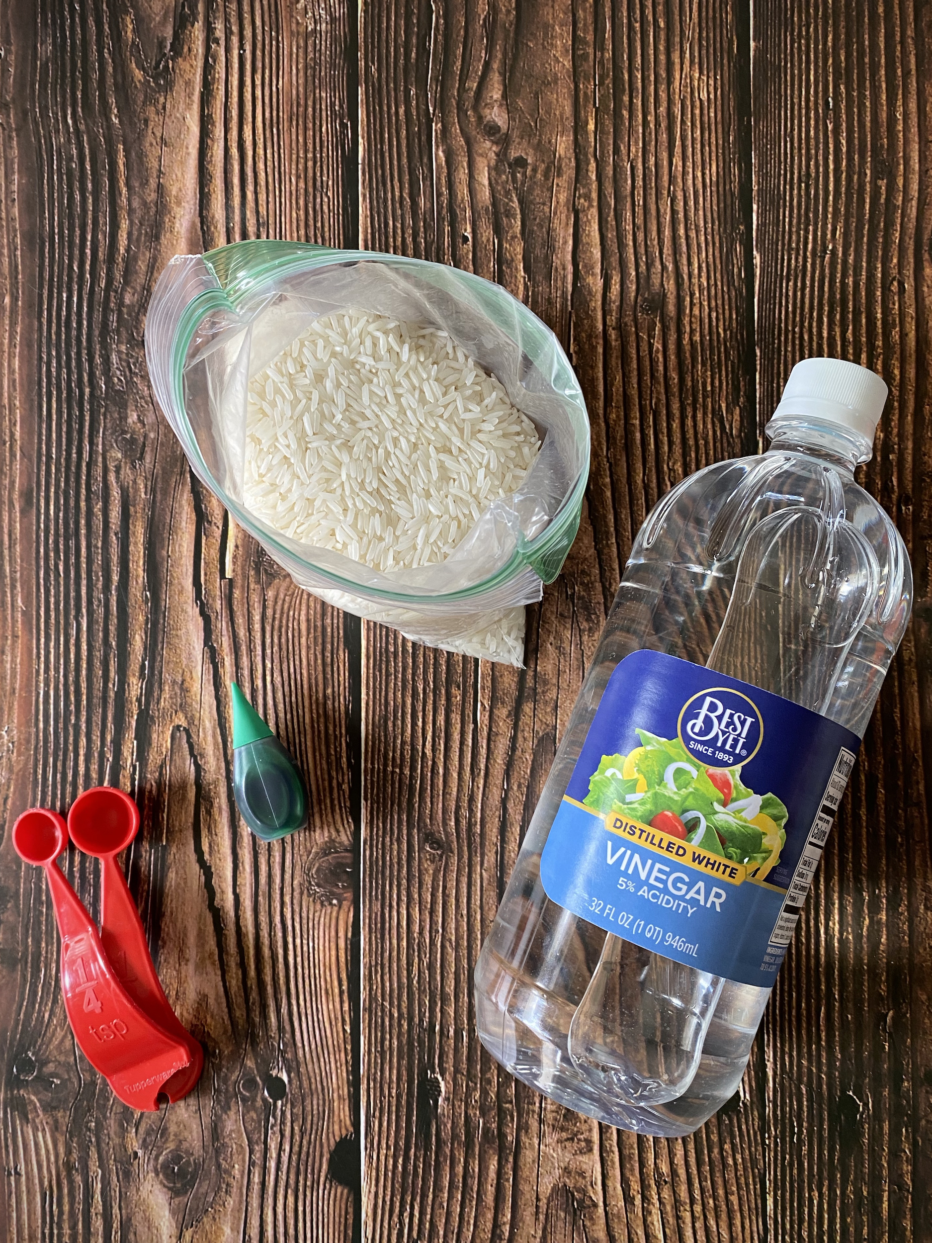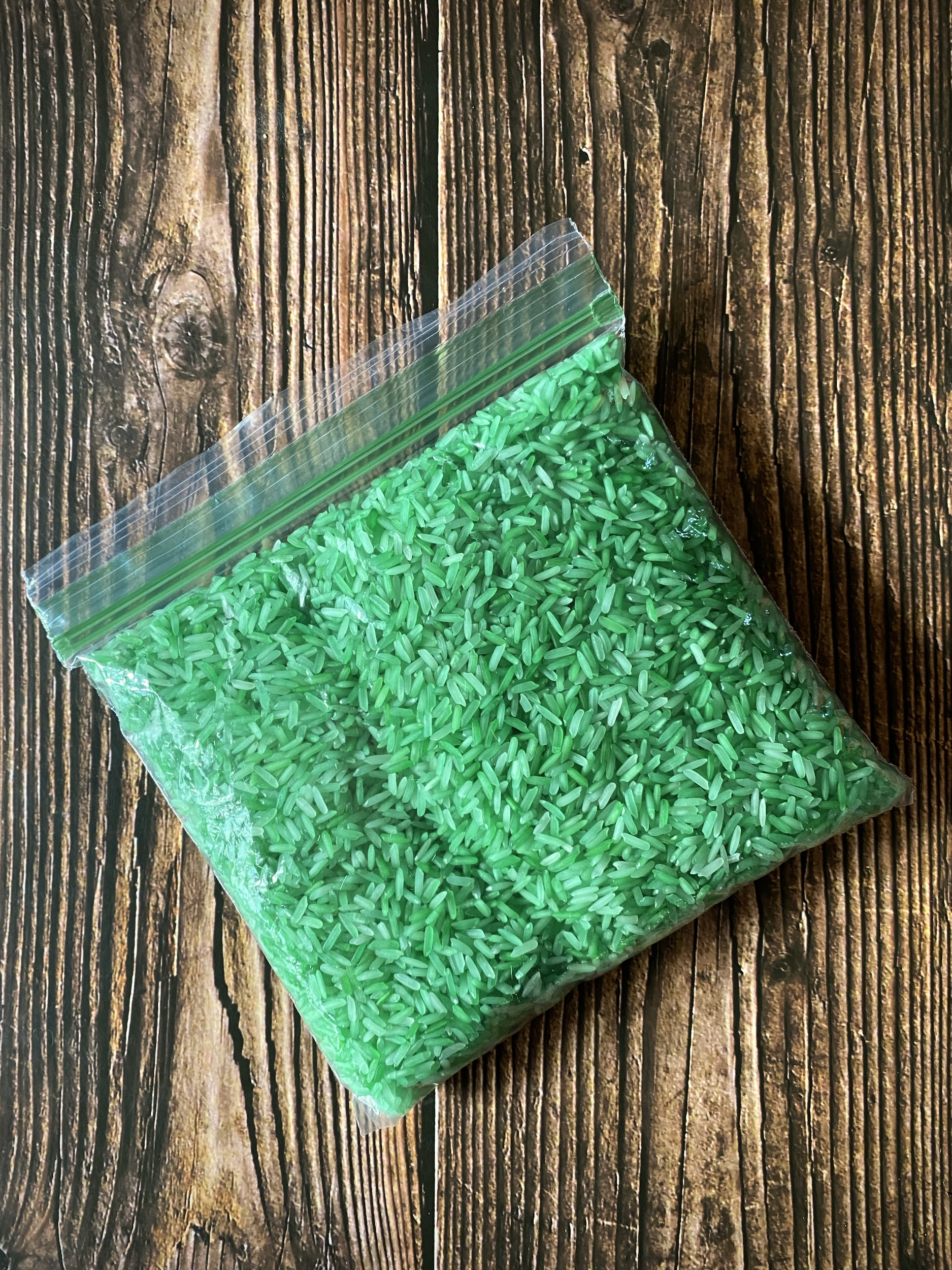 - Add the vinegar and food coloring to the rice. You can add however many drops of food coloring you’d like, I added 20 drops.